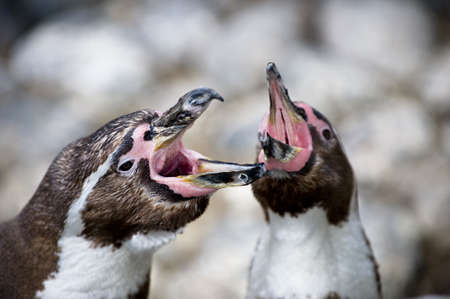 The Humboldt Penguins colony in the Copenhagen ZOO. The Humboldt penguin is mostly blackish-gray in color with a white breast. The adults have a black horseshoe shaped band on the breast and a white head stripe. They are between 26 and 28 inches long and