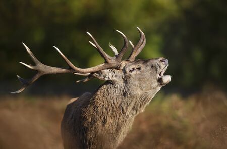 Close-up of a red deer stag calling during rutting season in autumn, UK.