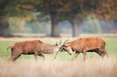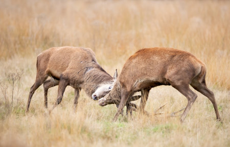 Two powerful red deer stags locking antlers in a fight during the rutting season in autumn, UK.