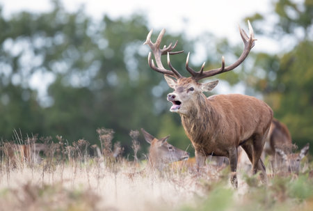 Red deer stag calling during the rut in autumn, UK.