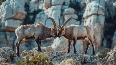 A dramatic confrontation between two male Iberian ibex, locked in a head-to-head battle against the stunning backdrop of the rocky formations at El Torcal, Malaga.