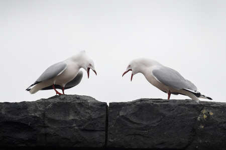 Two red-billed seagulls squabbling on the stone wall. Otago Peninsula.