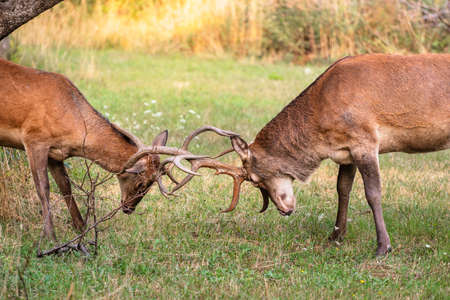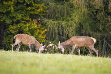 Two young red deer, cervus elaphus, stags fighting in rutting season over territory. Wild animals in conflict pushing against each other with antlers.