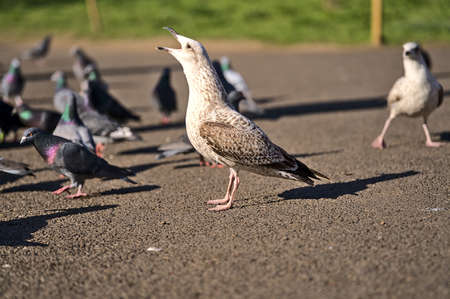 Beautiful closeup view of Western European Herring Gull (Larus argentatus argenteus) waiting for food among pigeons in Herbert Park, Dublin, Ireland. Soft and selective focus