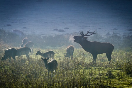 Deer with herd roaring on the meadow at sunrise
