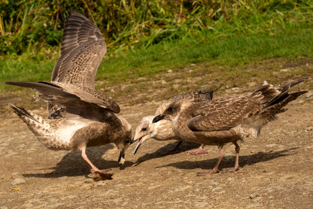 Three young mottled seagulls gather on a stony path, wings spread and beaks open as they interact closely under natural light near green grass.