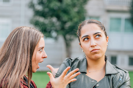 Boss yelling at employee. Colleague screaming on worker. Bulling on work. One woman shouting another woman facing each other face to face standing isolated color background. Side view