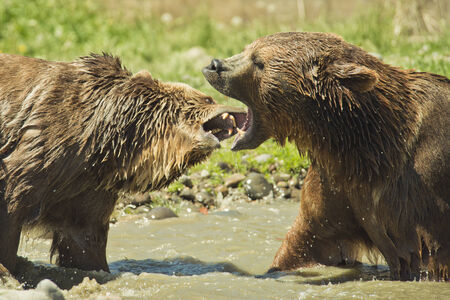 Two grizzly bears face each other, displaying aggressive postures by a flowing river surrounded by trees.
