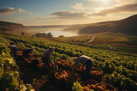 Harvest season brings workers together in a vineyard as they pick ripe grapes under the warm glow of the setting sun.
