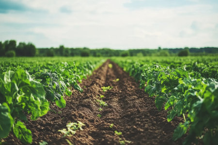 Straight rows of vibrant green vegetables flourish in a garden under a sunny sky, showing agricultural productivity and care.