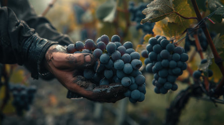 Detailed harvest farmer s hands picking ripe grapes, highlighting textures and vibrant colors