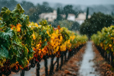 Vibrant vineyard rows bask under gentle rainfall, showcasing lush green and golden leaves. the scene essence of autumn and agriculture, with rain enhancing the natural beauty and tranquility of the vineyard setting. Generative AI