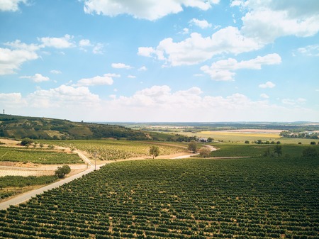 Aerial view of green vineyard at sunset. Beautiful summer landscape