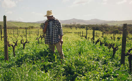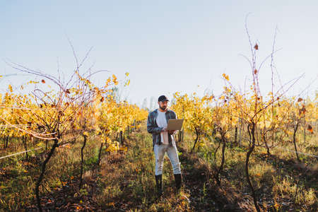 Young latin farmer man teleworking on his laptop in the middle of his vineyard plantation
