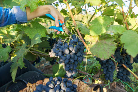 Harvest of grapes. A farmer's hand is cutting a bunch of blue grapes for local wine production at a nearby winery. Wine-making and restauration concept. Travel and agriculture background.