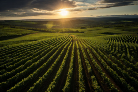 A vineyard at sunset with endless rows of grapevines creating serene landscape