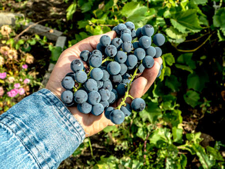 Closeup of a hand with blue ripe grapes. Fresh blue bunches of grapes. The concept of winemaking, wine, vegetable garden, cottage, harvest