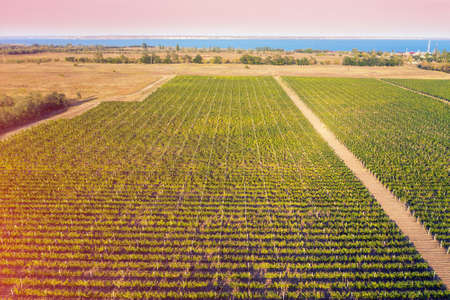 Agricultural landscape. Autumn view of the vineyard plantation by the sea. Row of vines. Aerial view