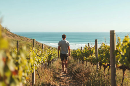 A person strolls through lush grapevines, enjoying the view of the ocean under bright sunlight.