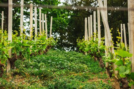 Plantation of grapes bearing vines in spring. Grapevine. Wine growing in the field. Agriculture. Young grapes with leaves. Fruit. Vineyard in early summer time