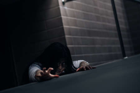 Bloody halloween makeup. Horror bloodthirsty ghost girl hair covering face and eye reach arm out, Asian woman zombie with blood she death and scary at night in tunnel, Happy halloween day concept