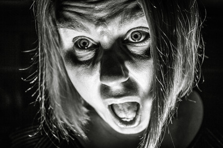 Close up portrait of evil scary girl possessed by a demon with a sinister smile