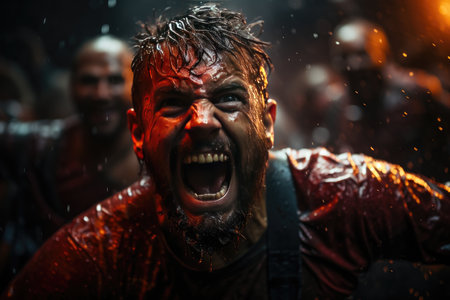 A soldier in military uniform, combat coloring, with scars and bruises screams against the background of smoke, consecrated by a bright spotlight with a black background. Black white contrast portrait
