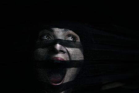 Horror ghost woman behind the matte glass. Halloween festival concept.