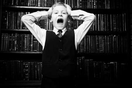 Smart boy in a suit stands in the library by the bookshelves and shouting. Educational concept. Science. Black-and-white portrait.