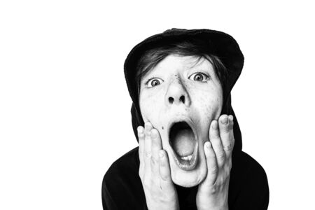 Young boy with light hair and freckles holds his hands up in front of his face, showing surprise or fear in a dramatic black and white portrait