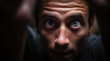 A man screams in despair with wild eyes and unkempt hair against a backdrop of dark ominous clouds. His emotion conveys a sense of urgency and fear.