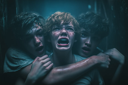 a mental illness poster featuring surreal theatrics showcases portraits of young male faces. the photo, captured with a nikon d750 by lewis morley, exhibits hyperrealistic murals and strong facial expressions. the detailed crowd scenes add depth to the composition, while the concept of goblin academia adds an intriguing twist to the overall image. ai generated