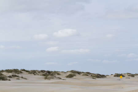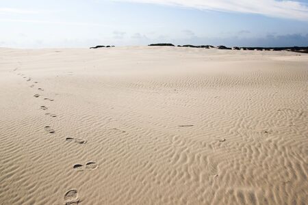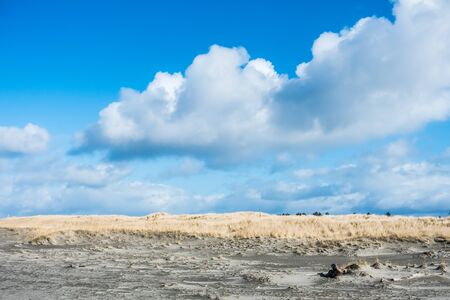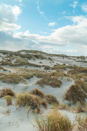 White sand dunes and dry grass on the shore with footprints on surface. Low angle landscape with bright cloudy sky at North Sea coast