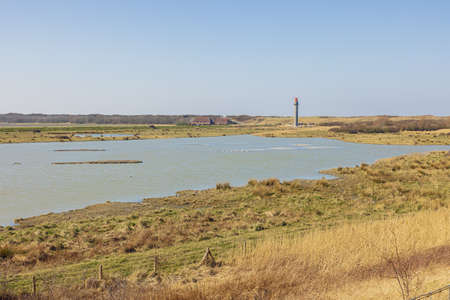 Schiermonnikoog view in the dunes with the lighthouse during sunset at the wadden island during a beautiful spring day. Schiermonnikoog is part of the Frisian Wadden Islands and is known for its beautiful natural scenery, including sandy beaches, rolling dunes, and lush wetlands.