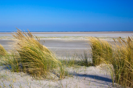 Dune landscape at the North Sea with view over the sandy beach and waving green helmet grass