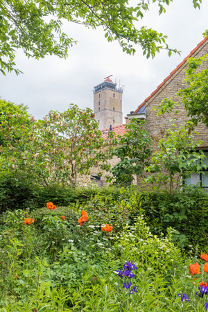 Lighthouse Brandaris in West-Terschelling with flowers in front at Wadden island Terschelling in Friesland province in The Netherlands