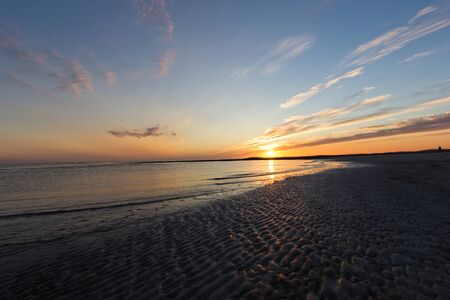 Yellow sandy beach in small Belgian town De Haan or Le Coq sur mer, luxury vacation destination, summer holidays on sunset
