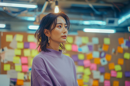 Thoughtful Professional Woman Pondering Project in Modern Office with Sticky Notes AI Generative