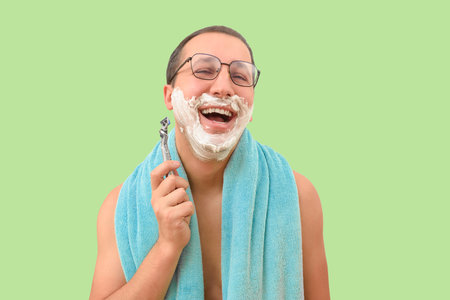a man in shaving foam on his face is about to shave and holds a razor in his hand on a green background