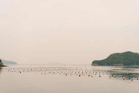 Beautiful view on cloudy sky and pearl farms from Mount Misen at Miyajima island in Hiroshima Japan