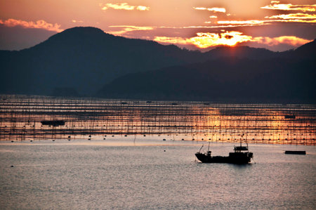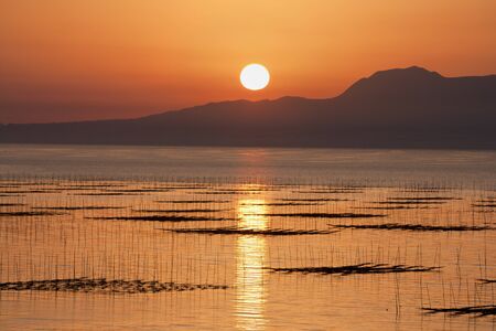 Niigata,Japan-October 20, 2020: Raft frames for culturing oyster at Lake Kamo in Sado, Niigata, Japan, at sunrise