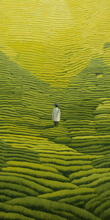 a white sheep stands alone in the center of a lush green field, reminiscent of fan ho's pattern-based painting style. this national geographic photo captures the sheep's isolation amidst the vibrant zigzag patterns of the grass. the composition draws inspiration from gu hongzhong's yellow and indigo color palette, creating a realistic and figurative depiction. ai generated