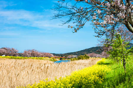 Beautiful rape blossoms and cherry blossoms blooming along the spring river in the blue sky