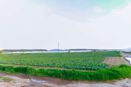 A large cabbage plantation is planted near greenhouses. Growing cabbage in large quantities. Agricultural activity.