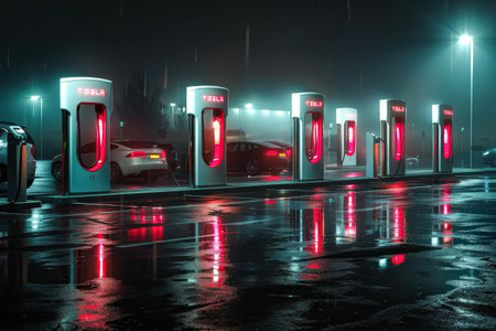 Row of Tesla charging stations are lit up in the rain. The lights are red and the cars are parked in the lot