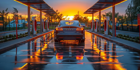 An electric car charging at modern station during a vibrant sunset, with wet pavement reflecting the warm glow .