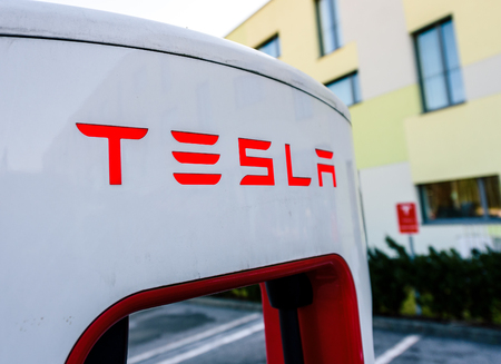 Ljubljana, Slovenia - January 23, 2018 - Tesla Supercharger charging station for recharging electric cars like Model S and Model X electric vehicles. Tesla public electric charger pump.