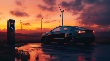 A serene electric vehicle charging at sunset amidst wind turbines showcasing a blend of technology and nature.