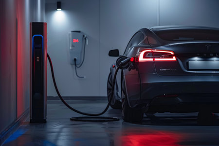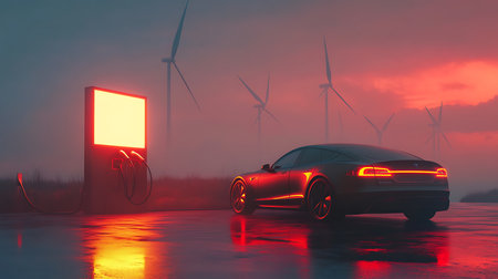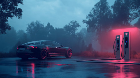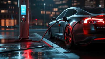 innovative electric car charges vibrant station showcasing future sustainable transportation. Red lights reflect sleek surface as energy flows.
