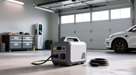 Portable power station on garage floor with electric vehicle charging in background.